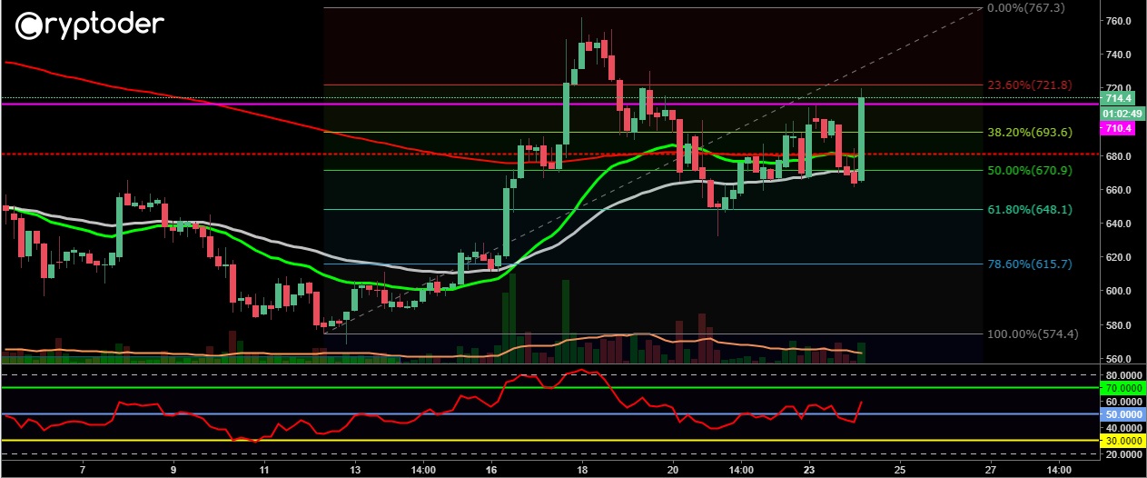 Seguidamente vemos como el precio rompe con fuerza hacia los €443 donde ha logrado establecerse por encima del 23.60% de Fibonacci el cual puede actuar como un soporte principal de precio. Ethereum está en sobrecompra en este momento por lo que una corrección es altamente probable en las próximas horas.