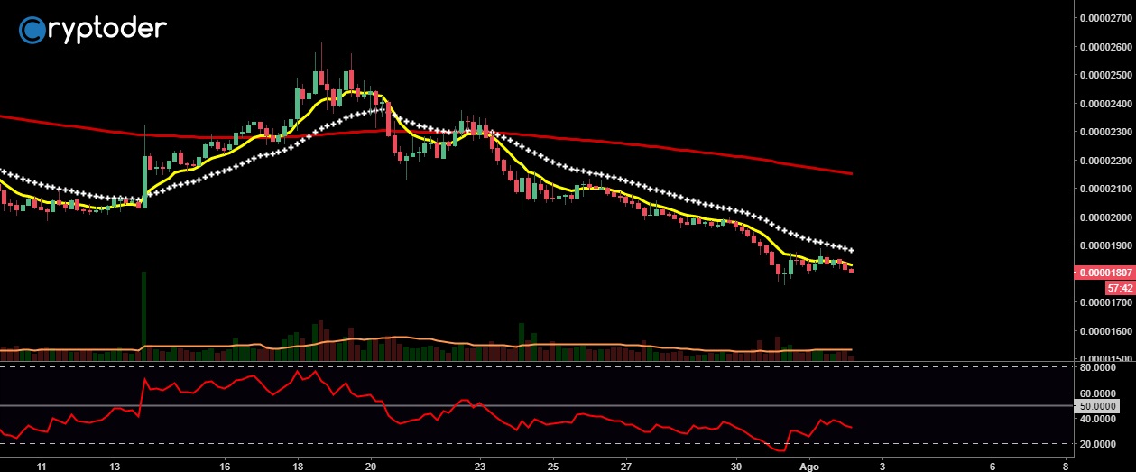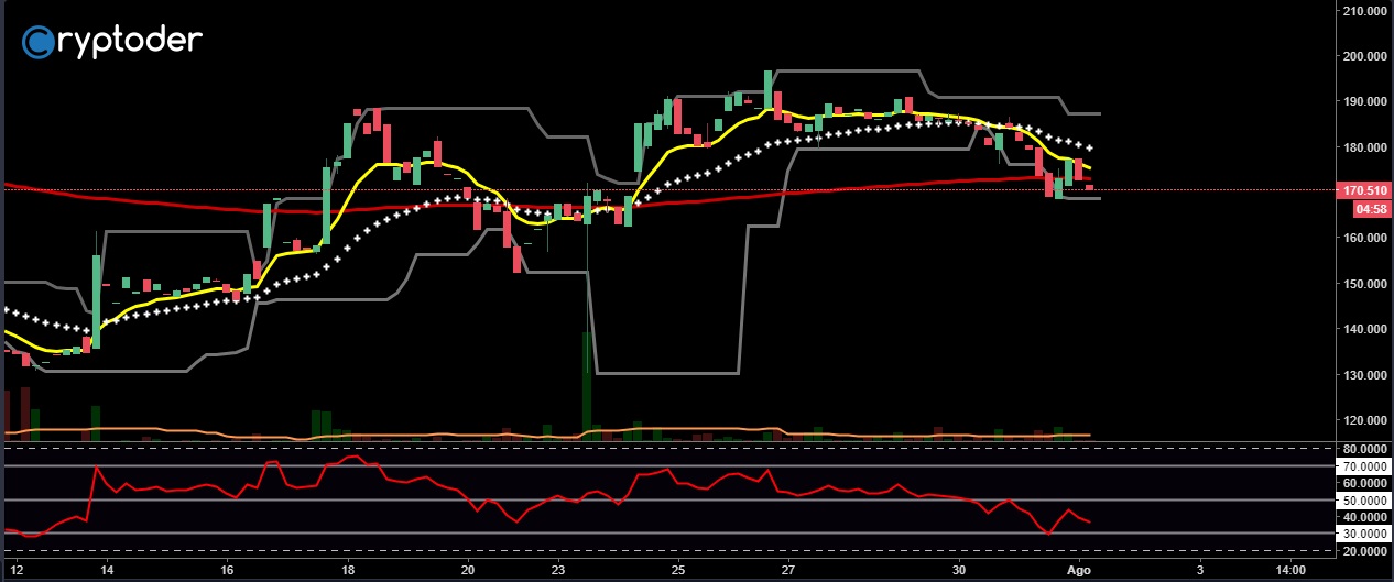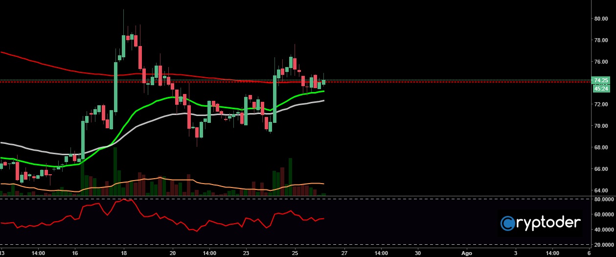 El Ether esta ganado terreno contra el euro, vemos como ha incrementado más de un 6% en las últimas horas, sin embargo podríamos esperar una corrección de mercado durante la jornada de hoy ya que el precio esta sobrevendido en este momento, si vemos el RSI este se localiza por encima del 78%.