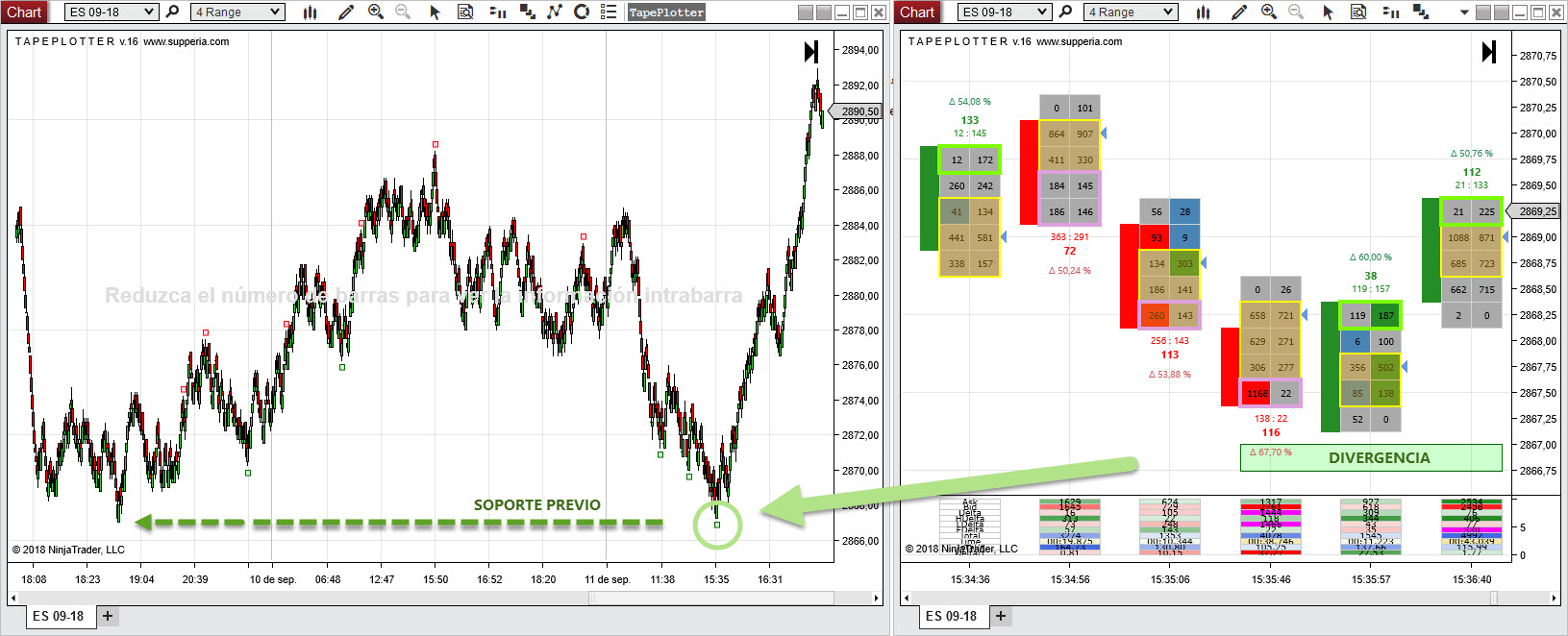 Esto obviamente lo hacen máquinas (sería un ejemplo claro de HFT). Esto no es malo per se. (Sobre HFT se podría hablar mucho, y no todo malo, más bien poco, pero sería otro hilo). Si la mano fuerte que vende termina ganando, esta acción te deja siempre una huella en el precio y es la divergencia delta. Si coincide con una zona