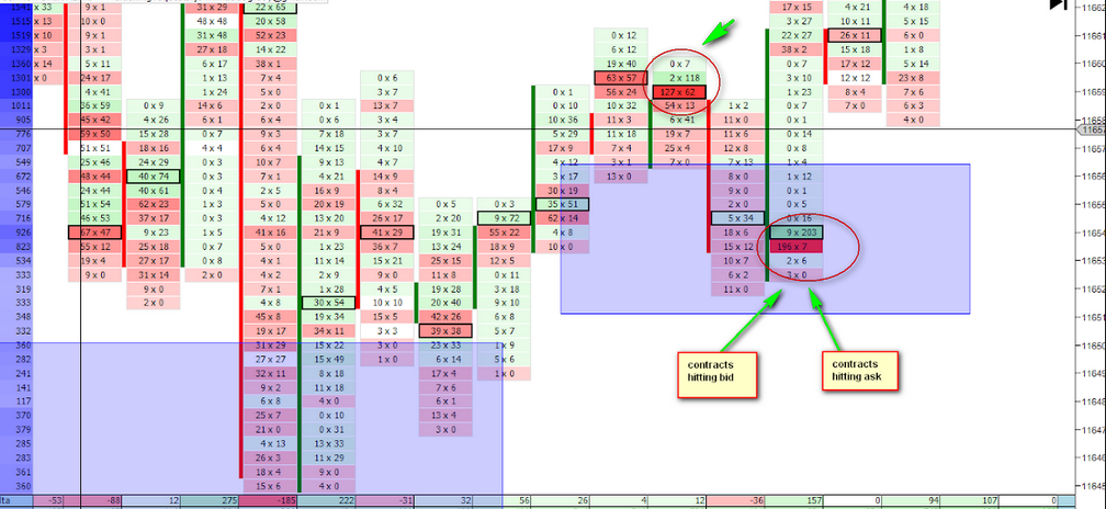 Se observan grandes ventas (1.168 contratos) que no hacen bajar al precio (baja 1-tick en la siguiente barra, pero es porque los algos que ponían las limitadas de compra se detuvieron, posiblemente al detectar que la mano fuerte que vendía a mercado se agotó, es un movimiento residual debido a los retails).