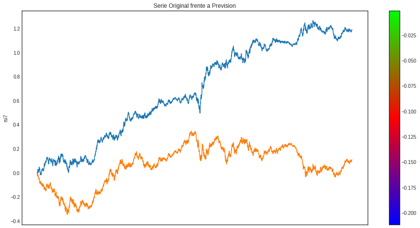 En este grafico azul son los rendimientos acumulados y el amarillo es el eurusd pero en escala aritmetica, y van desde el año 2000 al 2018, hemos dejado todo el 2018 para test