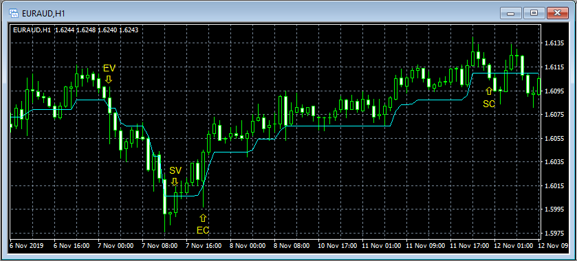 La variante consistiría es que si la línea está por debajo de los cierres, la línea se mantendrá horizontal hasta que haya un cierre más alto (en cuyo caso la línea sube hasta que esté a una distancia de 1,5 ATR's del cierre) o hasta que haya un cierre por debajo de la línea (en cuyo caso la línea pasa a estar por encima a una distancia de 1,5 ATR's del cierre). Si la línea está por encima de los cierres se procede análogamente.