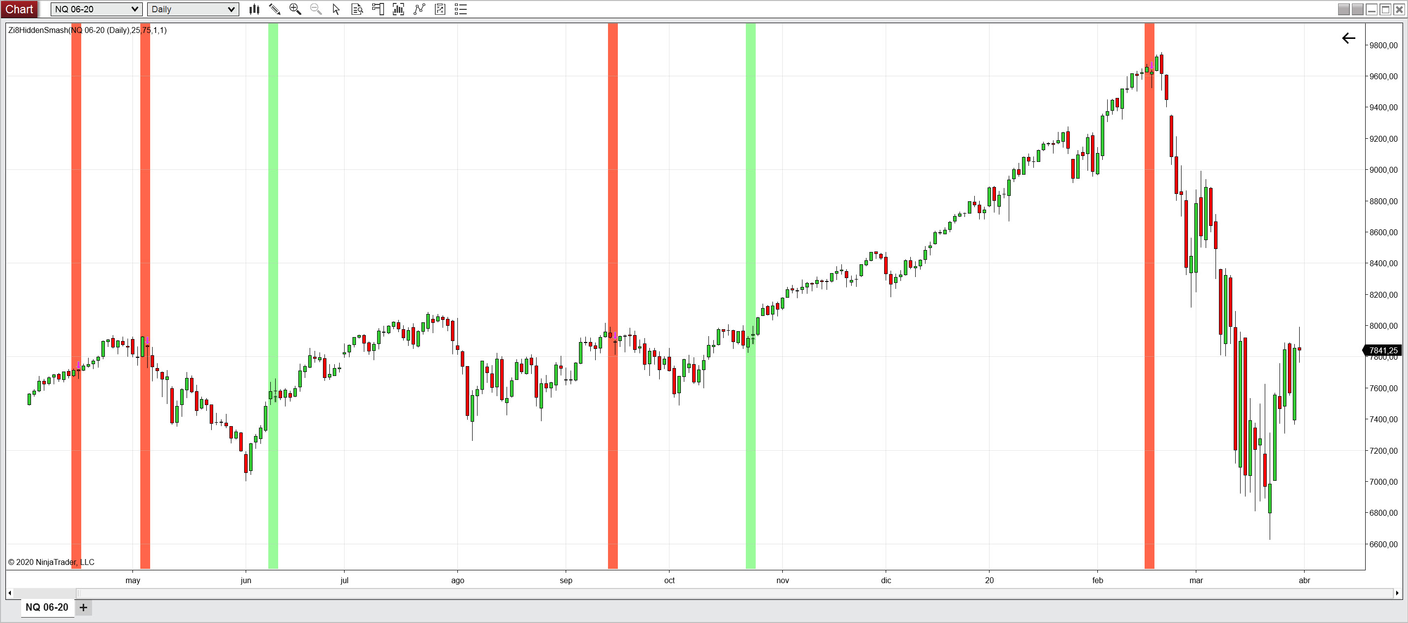 Repasando "muy por encima" el nasdaq en timeframe diario no di con ese patrón en el ultimo año tal como se ve en tus graficas aunque lo he visto en algunas ocasiones en timeframes mas bajos y también en datos