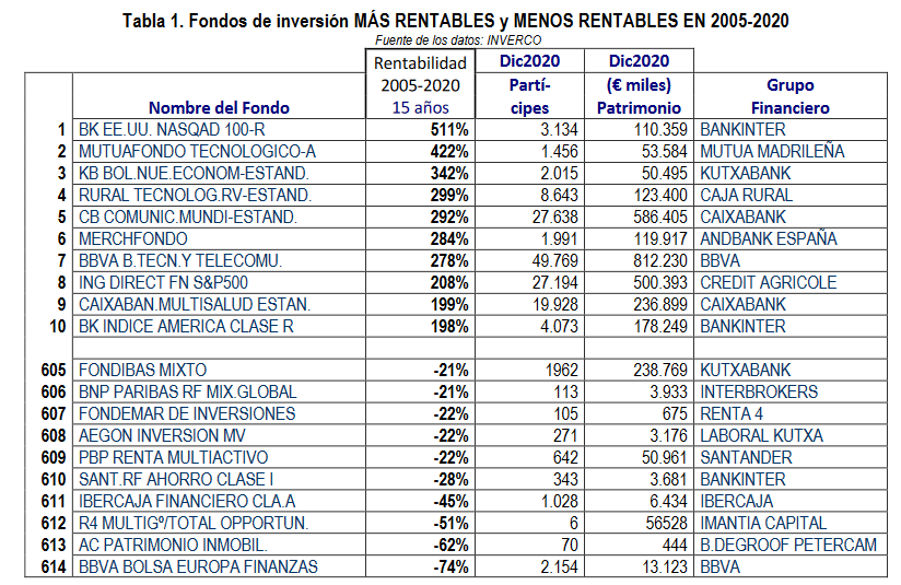 Llaman la atención la enorme varianza de la distribución de los resultados y la tabla con el top 10 de las colas de la distribución:La rentabilidad media de los fondos de inversión en España en los últimos 15 años (1,9%) fue inferior a la inversión en bonos del estado español a 15 años (3,4%) y a la inversión en el IBEX 35 (2,7%).