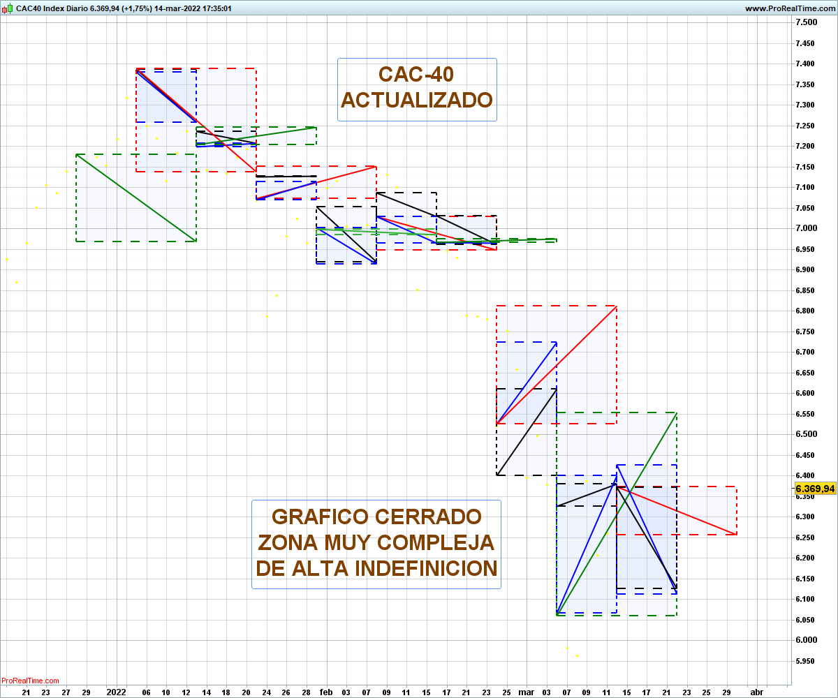 El Cac-40 en el gráfico venia corto desde la zona de 7200, ahora con la perspectiva que da el tiempo parece ser que la decisión de cerrar el gráfico en la zona de 6370, por considerar los rectángulos y diagonales del gráfico altamente complejos y de dificil interpretación, fue la correcta.!uff,menos mal!,porque nunca se sabe.