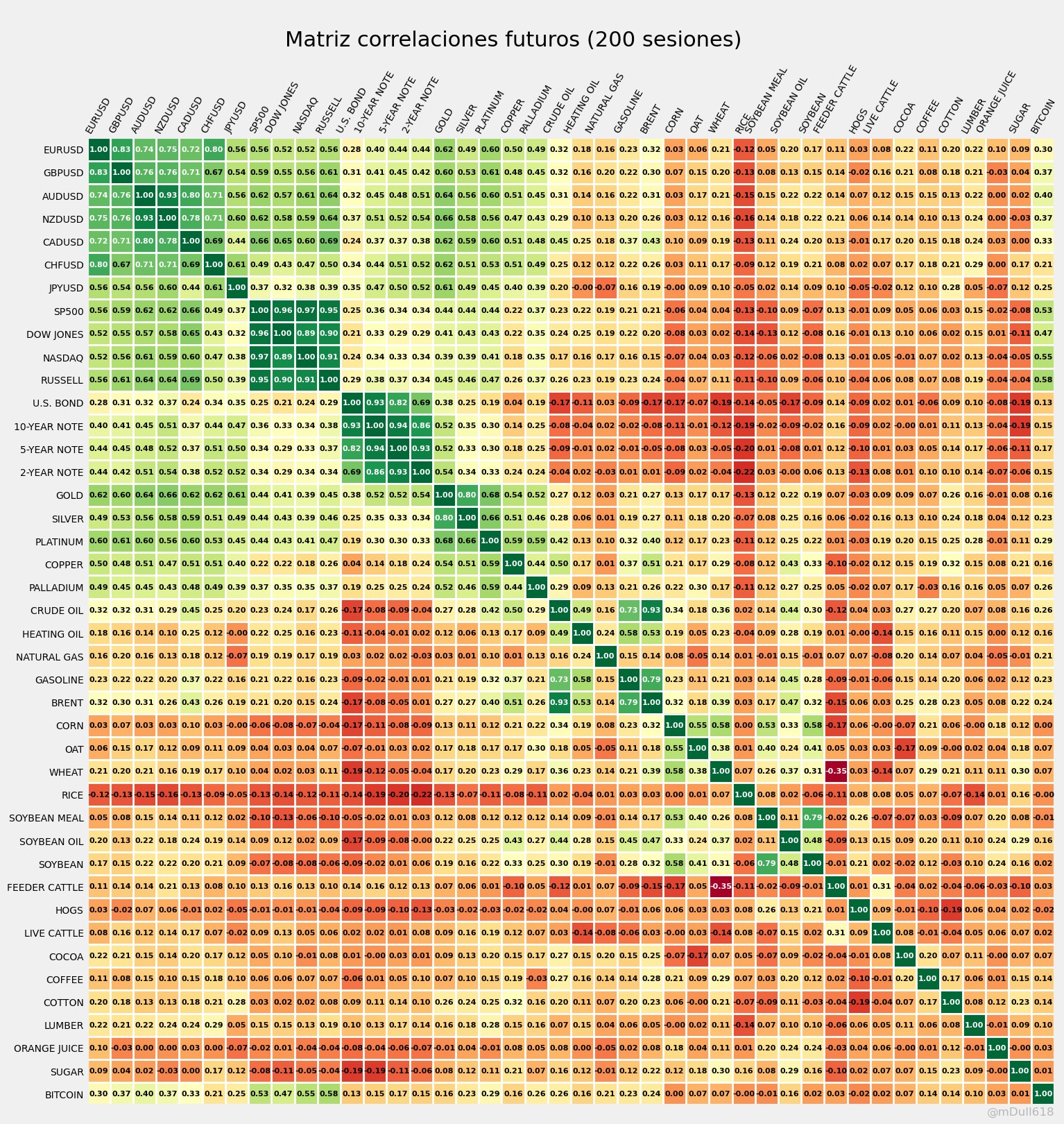 La correlación negativa en futuros de EEUU, es prácticamente inexistente, el arbitraje mantiene a raya las correlaciones y los estados de ánimo de los inversores hacen que los futuros en momentos de alta volatilidad se correlacionen prácticamente todos, con correlación 0 o cercanas ya es un punto a favor para generar estrategias multi activo.