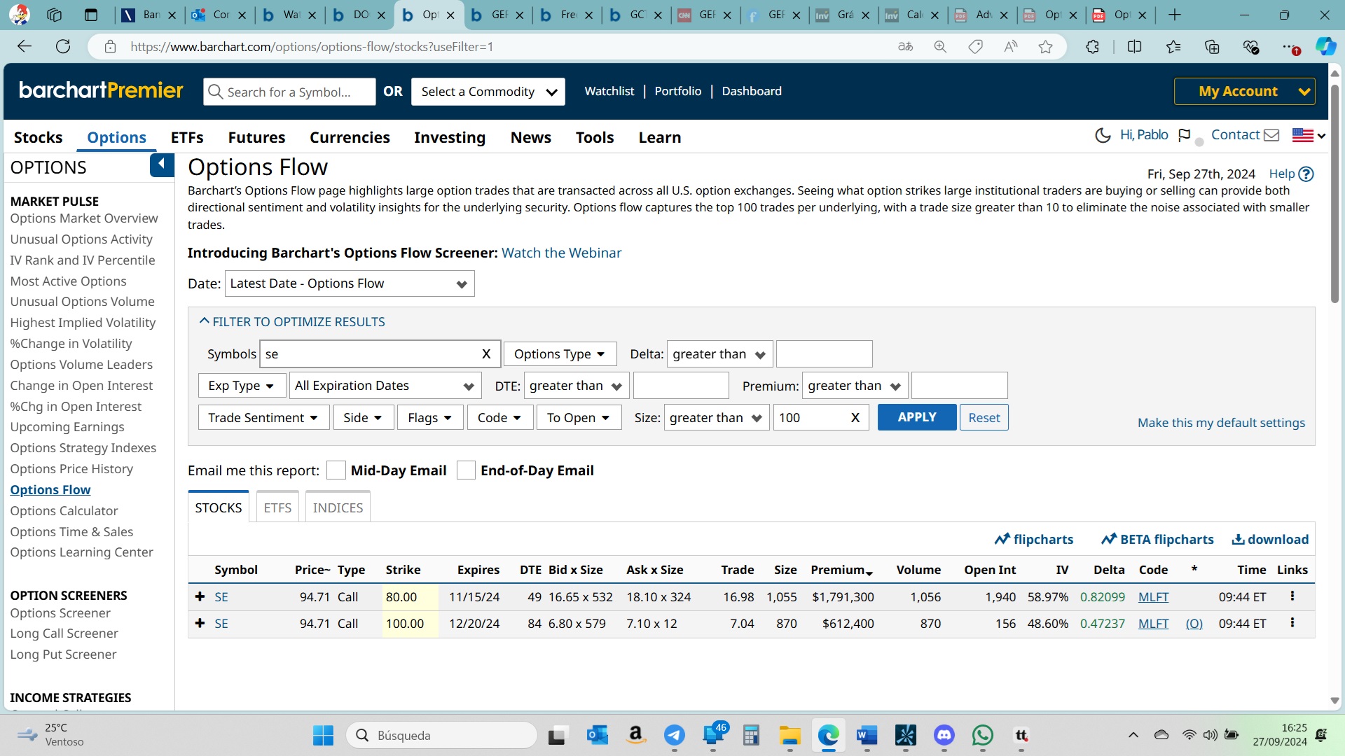 Yo de opciones no entiendo mucho y de IA menos, pero cuando quiero ver los movimientos de los grandes, sean compradores o vendedores, utilizo el flujo de opciones de Barchart.