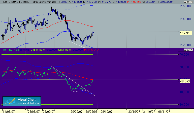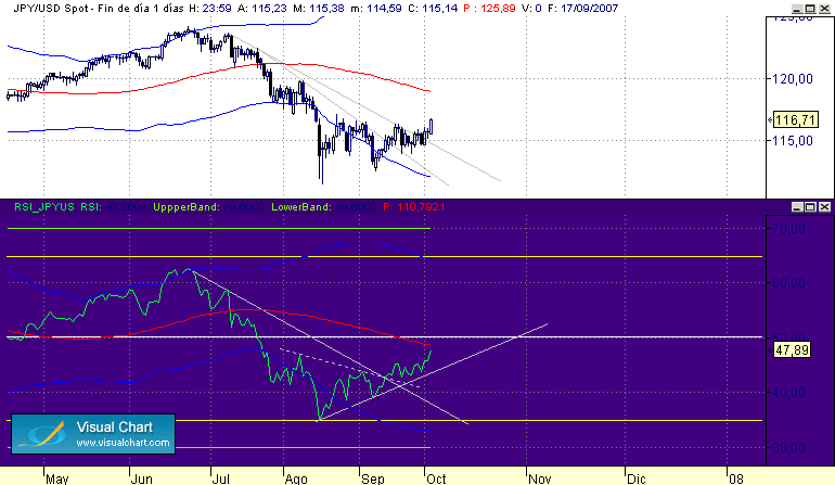 1º Toke a la directriz y forma divergencia ......100 pipos pabajo y al bajar forma cuña apoyandose en banda exterior baja bollinger en 45, el rsi corta su linea y el rebote esta servido, ahi piensa que stop necesitas........ muy poco, esas figuras de cuña ...........