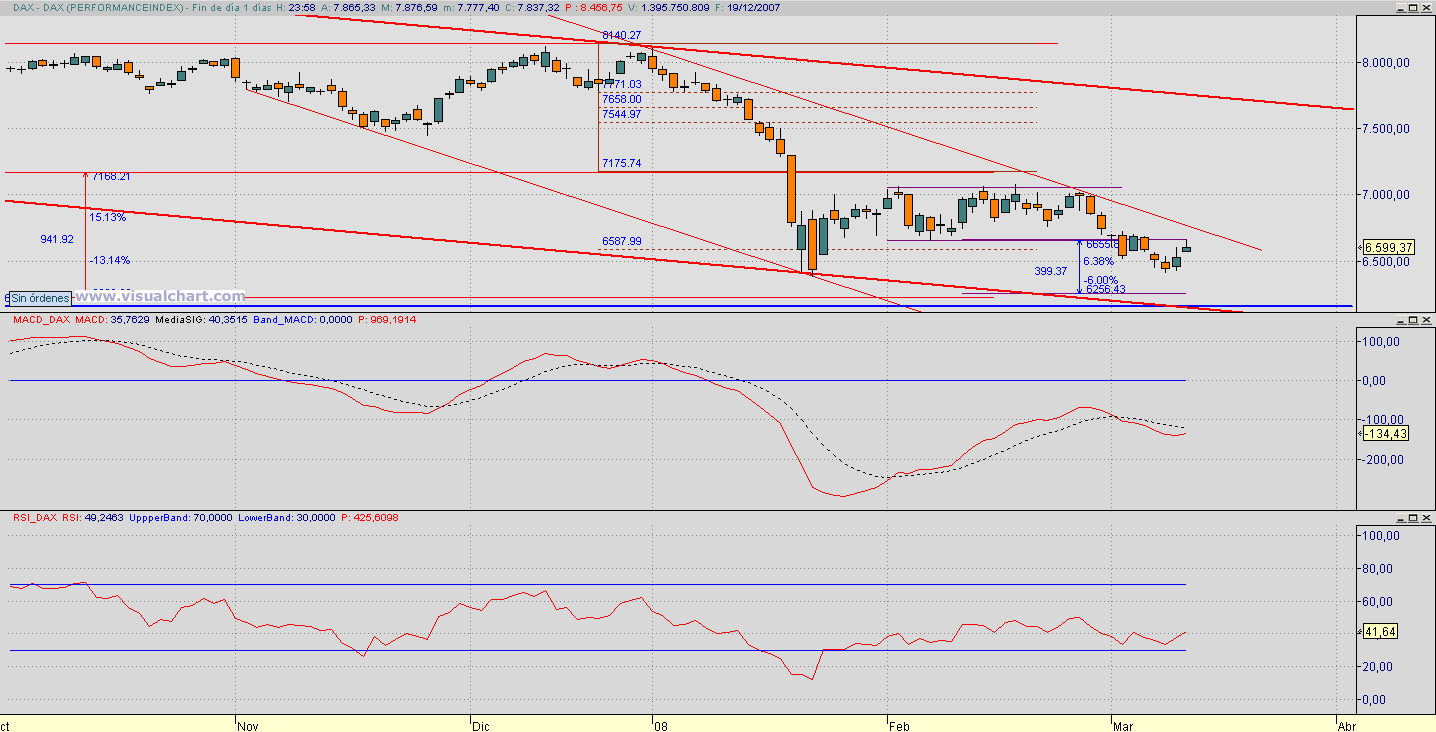 Erre yo te ha dado argumentos de por qué esperaba la caida aunque por ahora no es más que una corrección. Te dije lo de los canales rotos en el dow y dax y ahora te doy otro dato, por si se te ha escapado; ¿tas fijao en las velas del semanal del dow?. Concretamente, la de la semana pasada (que viene detrás de una estrella fugaz) está actuando de resistencia y mira, por si no te convences, te paso tb el gráfico del dax pa que veas como ha hecho pull en el canal roto, pull que mañana se acentuará pa ponerse a la par con los americanos.