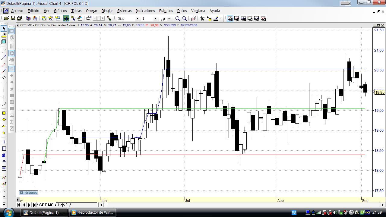 Bueno, y en lo referente a sistemas automaticos de bolsa, algunos de vosotros teneis sistemas basados en soportes y resistencias, por lo que habeis comentado. Asi que me he estado mirando un poco un posible método, y me he puesto a intentar desarrollar un buen indicador. Todavía está muy verde pero ahora mismo estoy en el punto de detectar resistencias, y creo que no va del todo mal. Además, como ya sabeis, las resistencias al ser rotas suelen convertirse en soportes, asi que es doble función. Os dejo una imagen de como trabaja el indicador.
