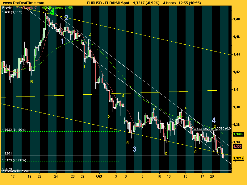 Está raro todo: en realidad creo que todo este bajadón es muy posiblemente correctivo y es la onda A de un triángulo, porque un impulso no suele caer tan rectito: va como un río que dice eu, pero esto va más bien como un grifo: si pones el mensual no hay ni resistencias ni nada que valga para medioparar al bicho. U sea, la misma pinta que el crash del 87 que era una onda A y la misma que el petróleo. Ahora, si es una onda A de un triángulo pos igual no frena en el 38 sino en el 50. Yo ahora mismo trazo líneas de tendencia y mientras no las rompa utilizo los oscilatas pa meterme hacia abajo por supuesto jejeje. Creo que el mercadillo va a caer y probablemente en ese caso el euro siga cayendo.