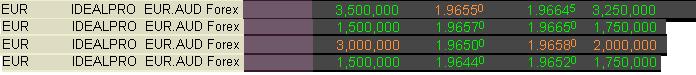 tape, en forex, tu orden no está en el mercado, excepto si utilizaras futuros, ke no es el caso, de modo ke IB o el maker ke sea no te ejecutará la orden de compra hasta ke el ask no toke ese precio, igual para la venta, no te la ejecutará hasta ke el bid en este caso no toke el precio.TapeFighter escribió:MrElliot, ¿en el EUR/AUD has probado a poner una orden de compra en el bid+1 o ask-1 y esperar? La idea es ver si puedes cazar alguna orden a mercado y así saltarte a la torera el spread.MrElliot escribió:de ahora mismo