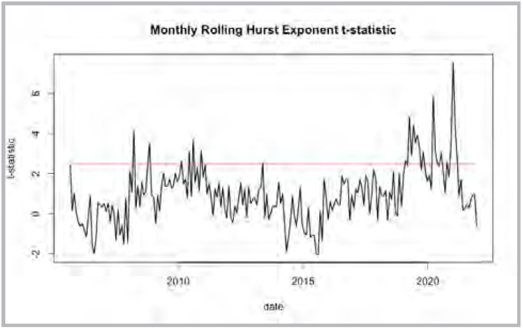 Para ilustrar el uso del exponente de Hurst, calculamos el coeficiente de Hurst móvil durante un período de veinte años (julio de 2002 – enero de 2022) en el ETF SPY (SPDR S&P 500 ETF Trust). Cada 20 días, calculamos el exponente de Hurst de los 3 años anteriores, su estadística t y su valor p. La Figura 1 ilustra el exponente de Hurst rodante. La línea roja representa el valor del exponente de Hurst esperado (es decir, valor neutral).