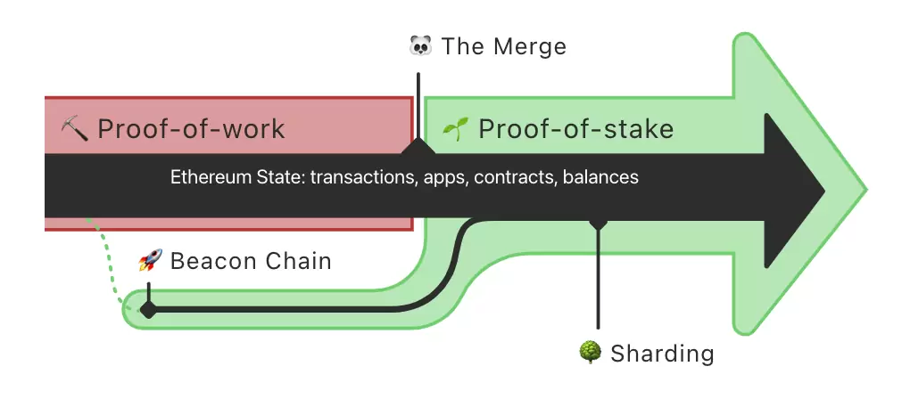 - The Surge, que incorporará la funcionalidad de sharding o fragmentación a la red. Mediante el sharding, los datos de las transacciones son divididos en pequeños trozos (denominados shards) que son distribuidos para ser procesados por cadenas de apoyo o sidechains, descargando así de trabajo a la red principal, agilizando su funcionamiento. Esta fase se espera que se complete en 2023 y aumentará notablemente la escalabilidad de la red.