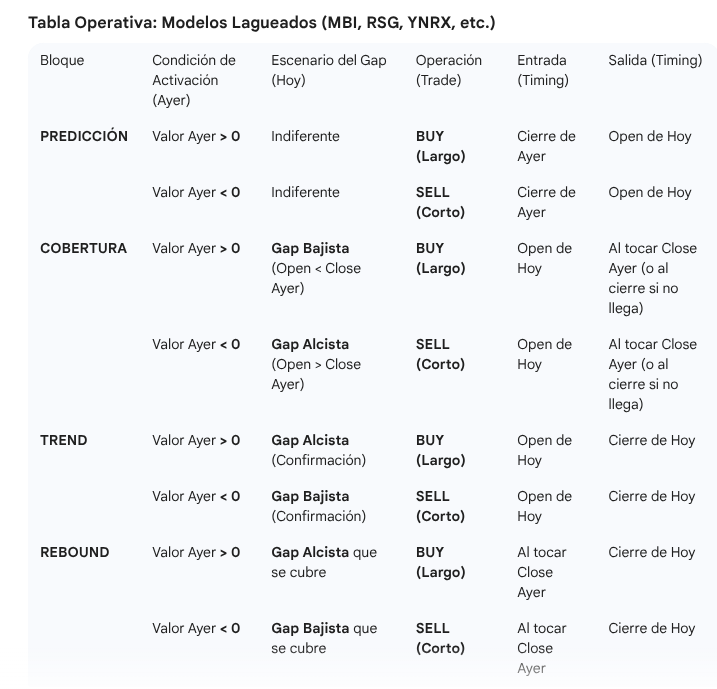Encontrada la conexión entre la formulación del CGI, y los modelos más recientes como el YNRX, el cual se usa para detectar máximos y mínimos. Se decide usar las señales positivas o negativas que utilizan los modelos, todos ellos, no solo el YNRX, ya que todos detectan puntos de inflexión, modelos como el MBI, RSG, YNRX e YNRY, y utilizar sus señales positivas o negativas del dia anterior, para operar los gaps de apertura de dia seguinte, es decir se usan valores lageados, de t-1, para operar los gaps de apertura en t, con cierre intradía, es decir la operación está en el mercado un máximo de 1 dia (de open a close), en los casos del modelo de cobertura, seguimiento de tendencia (trend), y de rebote a precio de apertura (rebund), y exceptuando el modelo de predicción que está abierto desde el close en t-1 al open en t.