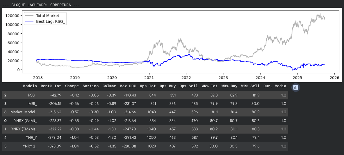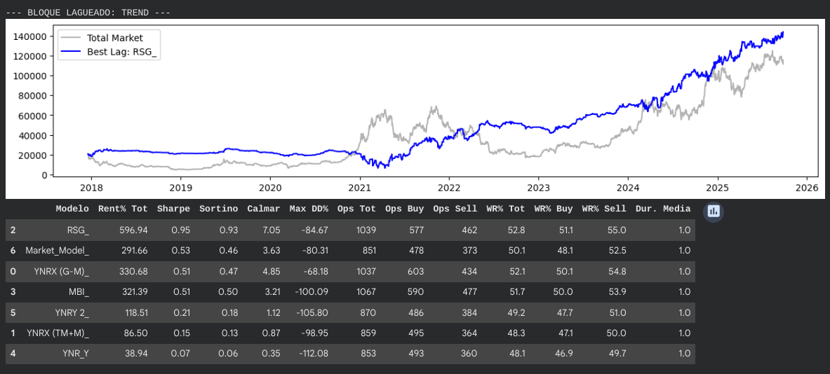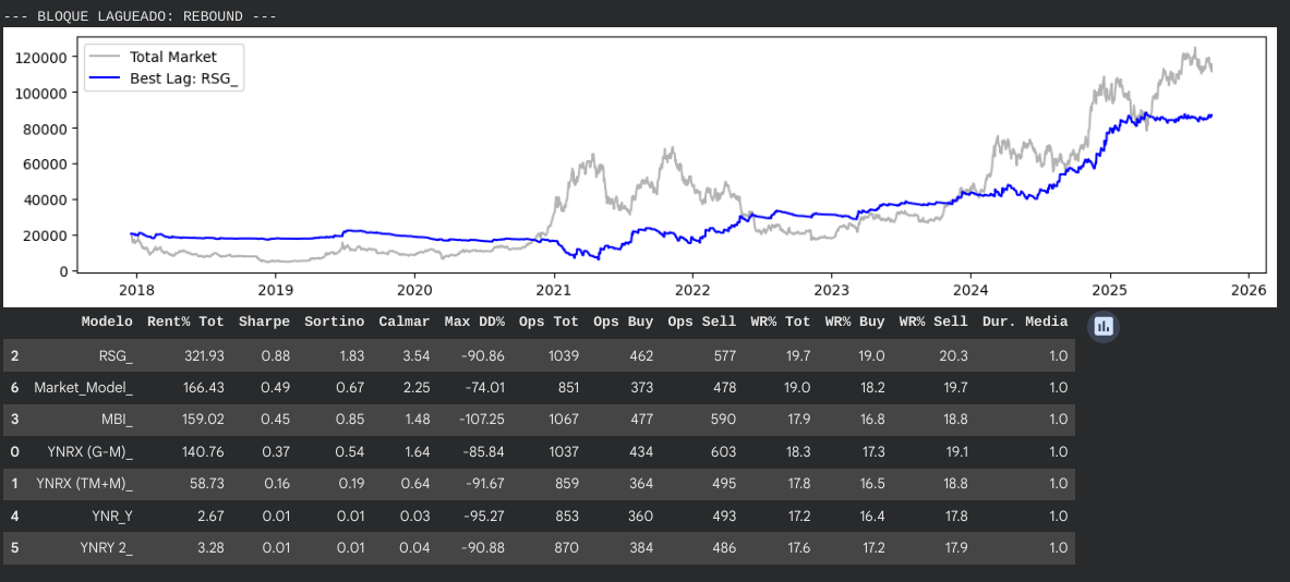 En siguientes post, y por adelantar los descubrimientos, veremos como solo los modelos MBI y RSG, presentan carteras o señales rentables en los 11 activos analizados más líquidos del mundo (excepto acciones), y como las curvas de equidad de esas carteras, esconden muchas más cosas que solo beneficios, parecen poseer las mismas cualidades que los modelos que generan las señales.