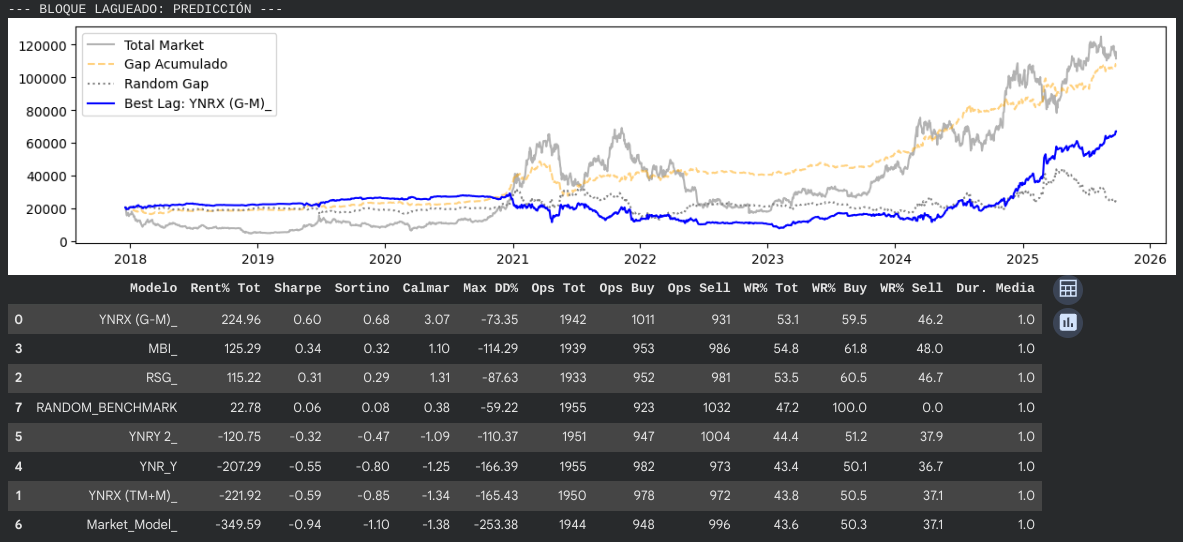 Modelo de predicción del gap Modelo de cobertura del gap Modelo de seguimiento de la tendencia del gap Modelo de rebote del gap a precio de apertura Los resultados me parecen impresionantes, si tenemos en cuenta que son modelos intradía, incluye las comisiones fijas, spread y desplazamiento de Interactive Brokers para clientes minoristas, y que se operan en función del signo de los modelos MBI, YNRX, YNRY y RSG del día anterior (valores individuales, no acumulados).