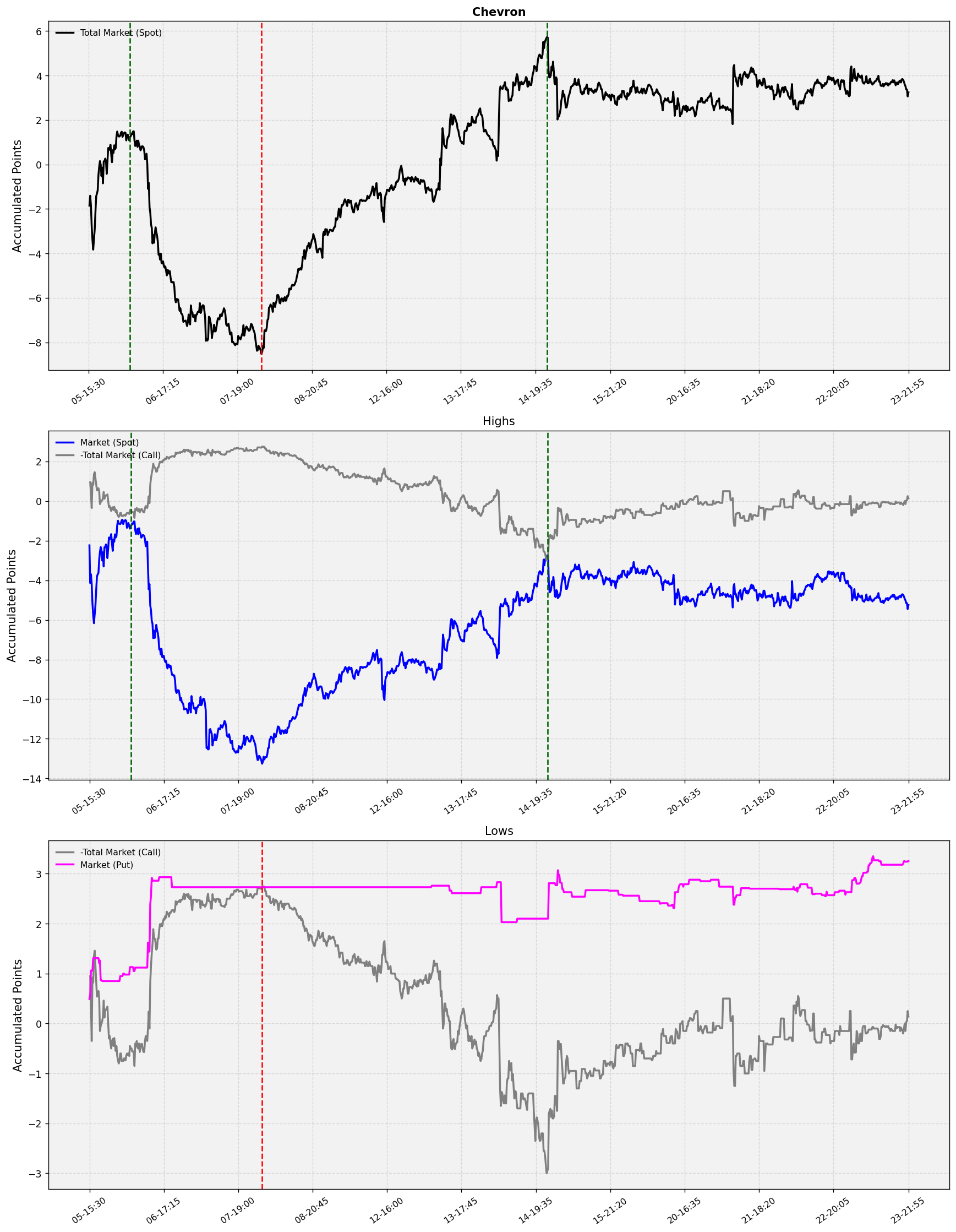 Y eso es precisamente lo que se compara en el gráfico de Chevron, estamos comparando los precios del subyacente, con la de las opciones call o put, pero incorporando la descomposición gap-market.