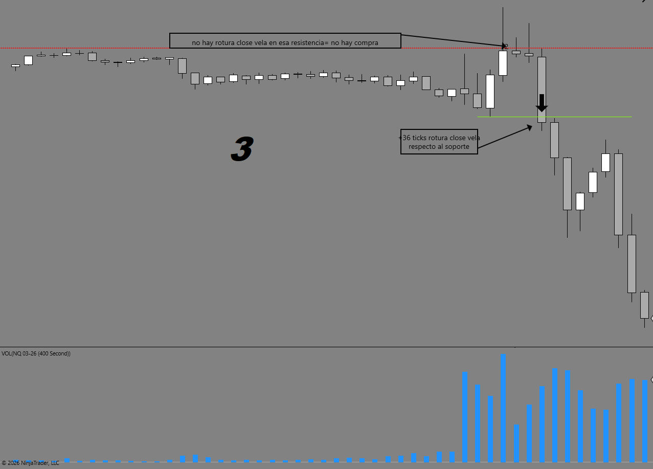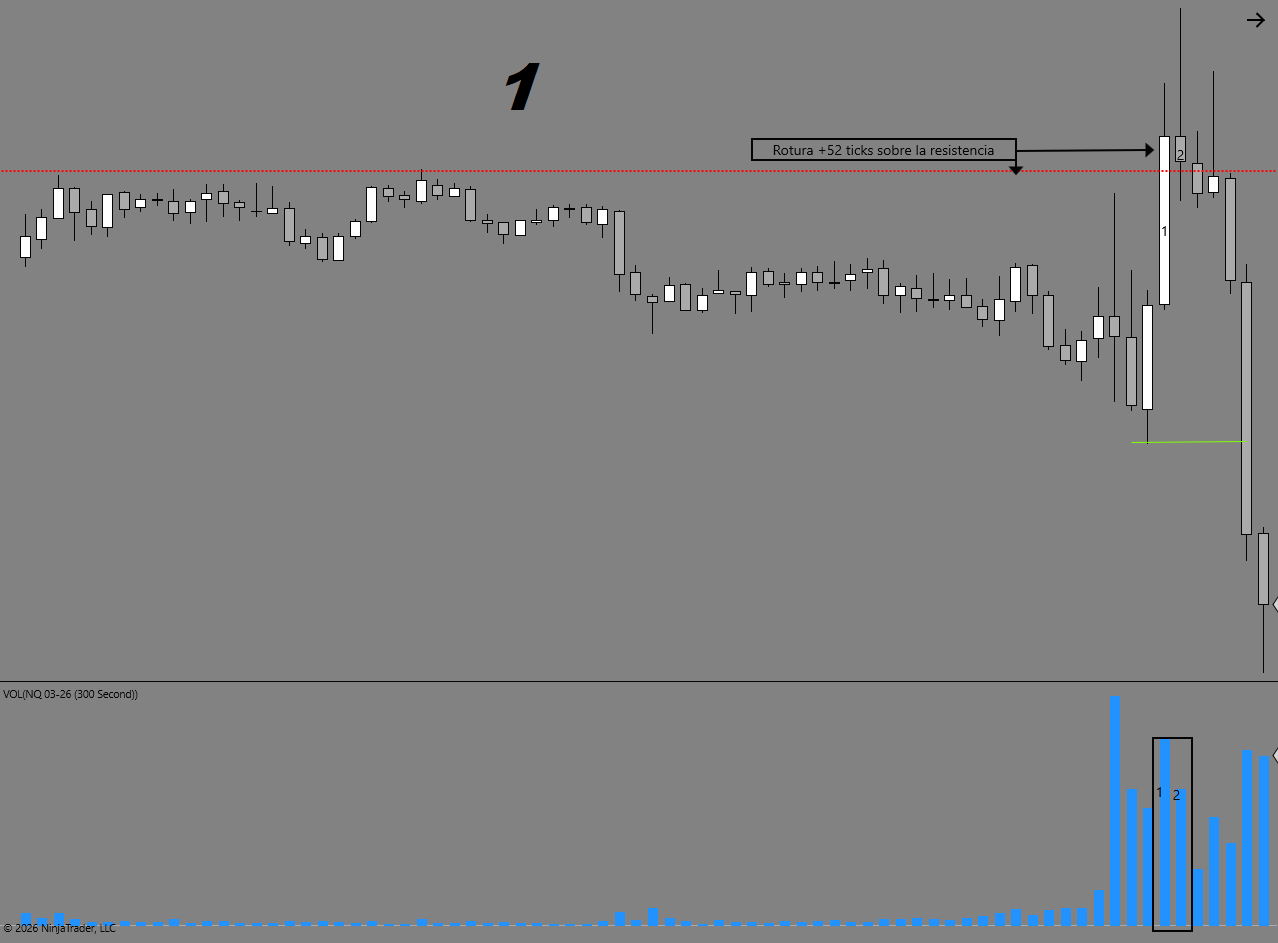 TimeFrame de 5 minutos: Vela 1 robusta rompe resistencia con 52 ticks por encima con un volumen potente, la paradoja es--> compro ? o espero ?, si compro el stop es terrible, si espero puede ocurrir que, o el precio se va sin mí o me recoja, en cualquiera de los dos escenarios, estás muerto.