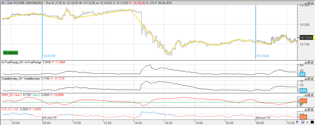 El asunto es que donde hay tendencia (centrémonos en la clara que hay algo después e las 14h), se produce una reducción de señal (predominio de ruido), que es interpretado por los indicadores de volatilidad, netamente y para toda la zona de tendencia, como un aumento de la volatilidad.