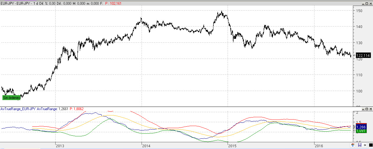 Toma el valor ATR Diario de 100 periodos con el EURO/ JPY y aplícale don envolventes a esa media con 2 desviaciones estándar