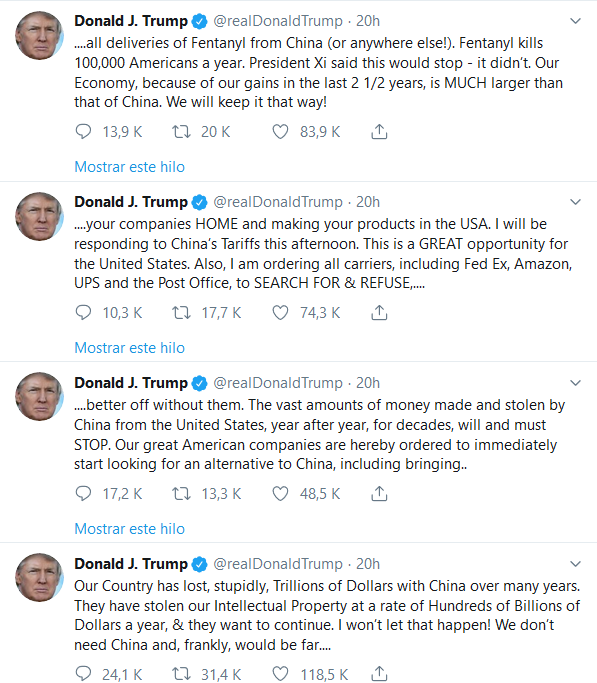 Además todo el mundo sabe que va de farol porque por muy presidente de EEUU sea no tiene poderes para hacer que las empresas salgan de China (y aún imponiendo ciertas medidas, eso no se puede hacer en un espacio corto de tiempo).