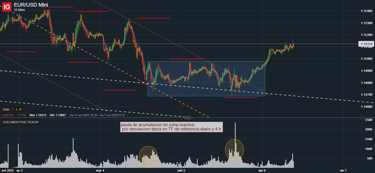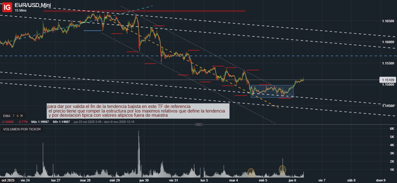Solo comentar que la zona reactiva dinámica por desviación típica con los datos de esa tendencia, ayer cumplió como zona reactiva y el precio revirtió la dirección en esa banda dinámica de diario y 4 h con una reversal apoyada por acumulación de fuerza en TF bajos como 15m. Esto evidencia el valor que aporta el análisis multitimeframe.