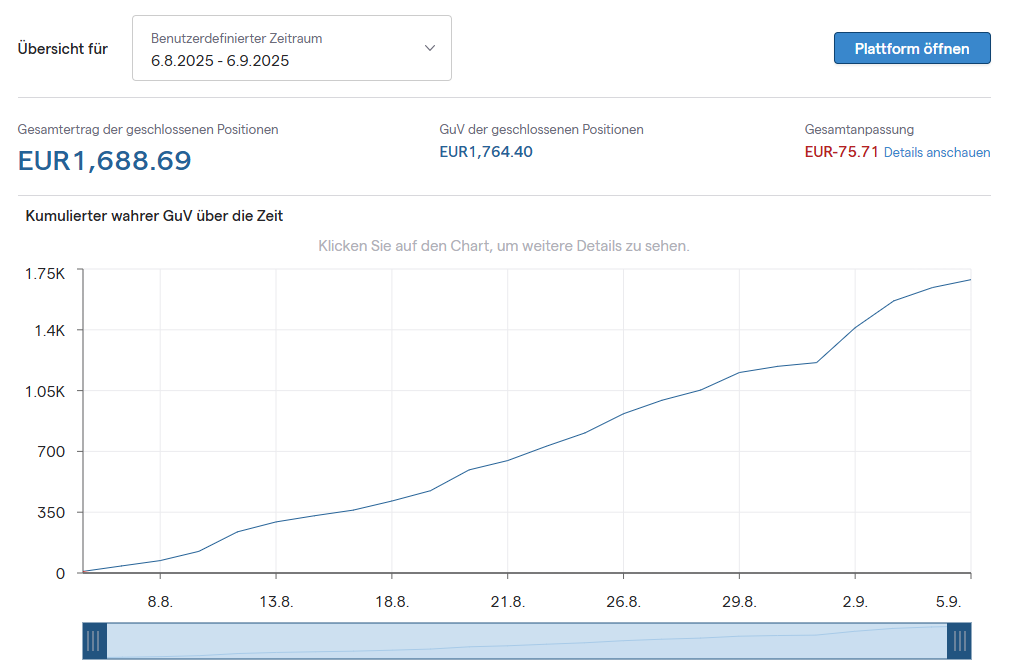 Así, de un capital inicial modesto, de ganancias mensuales aparentemente pequeñas y de la aplicación constante de Thinking Big y el interés compuesto surge algo extraordinario: un motor de libertad a largo plazo — y con mi estrategia de trading en el German 40 (DAX) este camino es realista y alcanzable.