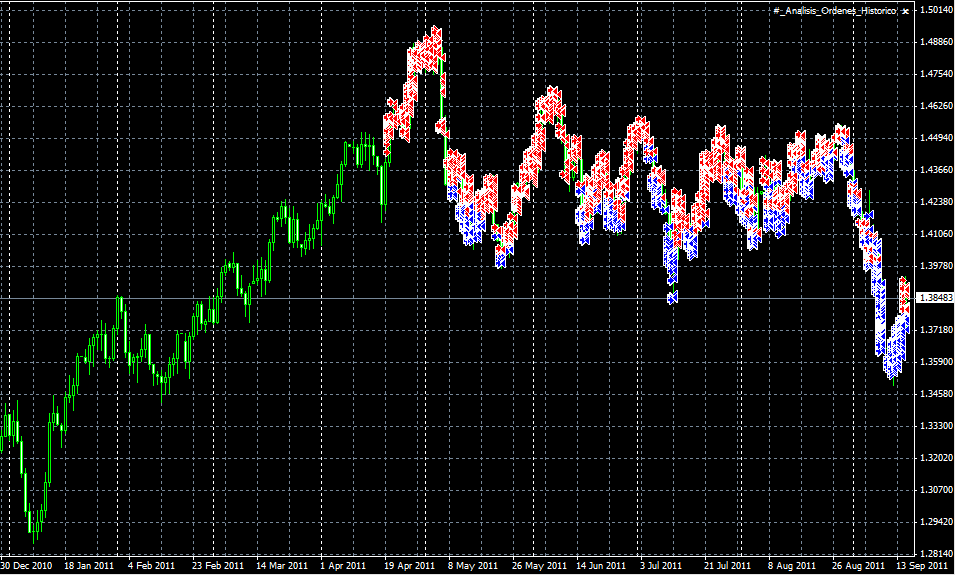Si la prueba fuese más larga y pillásemos un rango de precio más ámplio, también se observaría como cuanto más separados estemos de la media de los precios mayor será la concentración de posiciones del mismo tipo. Observar como por encima de 1,45 no tenemos apenas ninguna buy y por debajo de 1,38 no tenemos sells, mientras que en precios intermedios del rango si que mezclamos buys y sells.