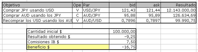 PD: para quien pueda estar interesado y brevemente, lo del triángulo de arbitraje consistiría en (siguiendo los cruces mencionados arriba como ejemplo) comprar JPY usando USD, a continuación comprar AUD usando los JPY y finalmente volver a comprar los USD usando los AUD. Si esto se hace en un momento en que la "eficiencia del mercado" está en proceso de "recolocarse", se puede obtener un beneficio de la ineficiencia transitoria y encima sin riesgo (teóricamente).