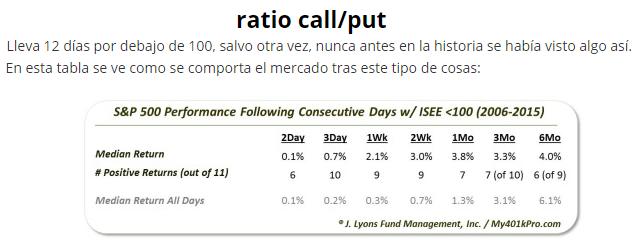 Fíjese como en marzo de 2001 y en octubre de 2008 se produce algo similar a lo que tenemos hoy día. Se alcanzan niveles máximos de margin debt y retrocesos posteriores con caída de los índices. No es algo que podamos tomar como eficaz al 100%, pero al menos tiene sentido el pensar que los precios tienen más recorrido a la baja que no al alza. Es decir, la tendencia se puede haber invertido ya.