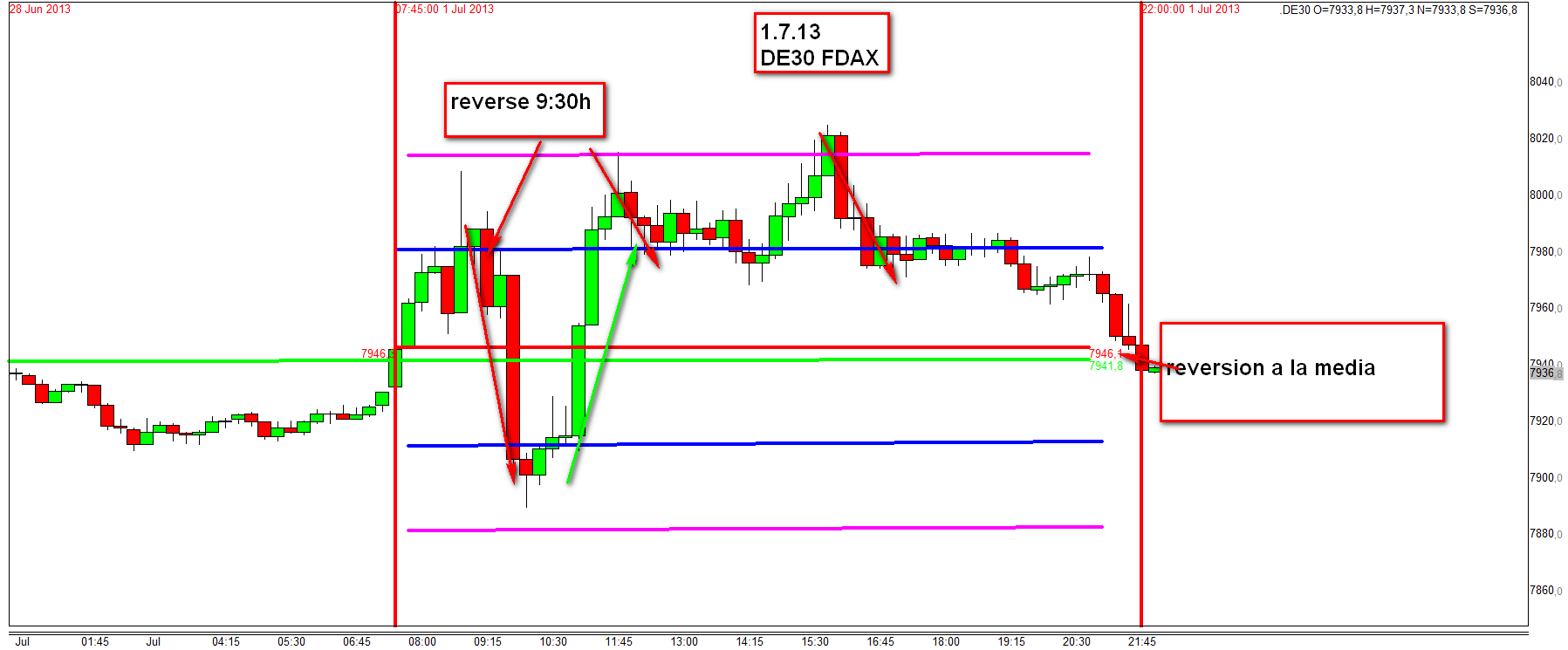 El regreso a la media es iniciado con un reverse sea DOW o DAX. Este reverse puede ocurrir en cualquier sitio