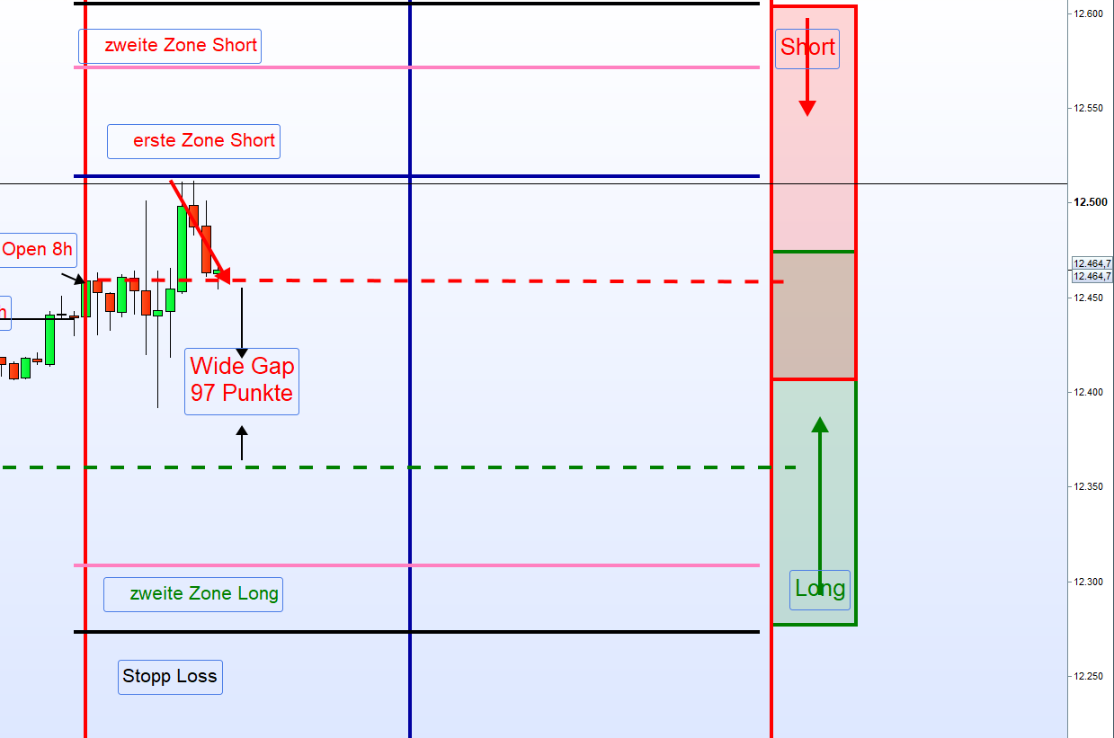 Tal y como comenta su estrategia, para los niveles de volatilidad del VDAX entre 25 y 30 puntos, generamos los niveles de operativas para las zonas de largos y cortos a 55 puntos de los puntos clave de cierre (22:00) del FDAX del día anterior y apertura 08:00 del día en curso, por otro lado, tras las alzas de la noche anterior y basado en el cierre del DAX, hoy se producido un Wide GAP, por tanto la primera zona de largos se encuentra situada en el precio de cierre de ayer a las 22:00 del FDAX. (finalmente el wide gap no se opera ya que el precio no llegó a objetivo)