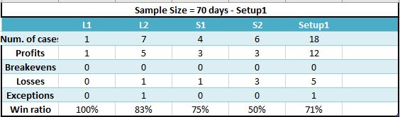 Sigo completando estadísticas, a falta de los datos de hoy, los resultados de la mañana y los setups de la tarde quedarían del modo siguiente (70 días):