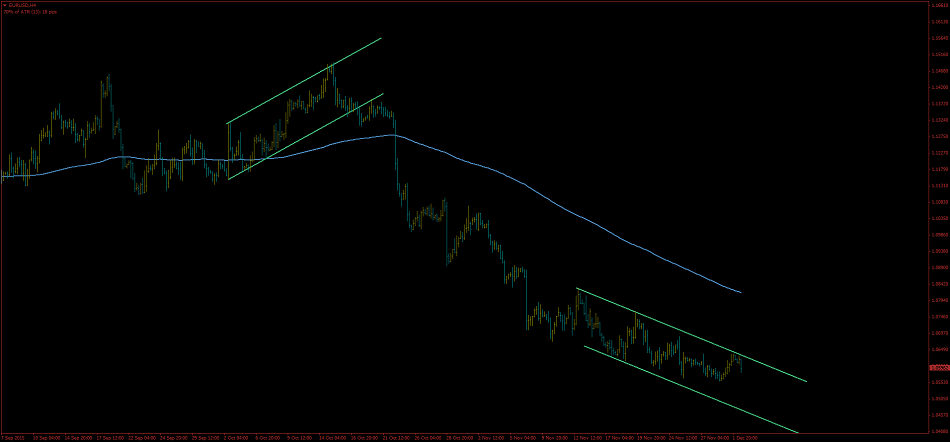 Si haces una gráfica del EURUSD en timeframe mensual podrás ver que hay una tendencia bajista hasta marzo, allí se paró y el precio ha deambulado hasta ahora en lateral. Si hacemos zoom (timeframe diario), aparece el canal que nos compartiste.