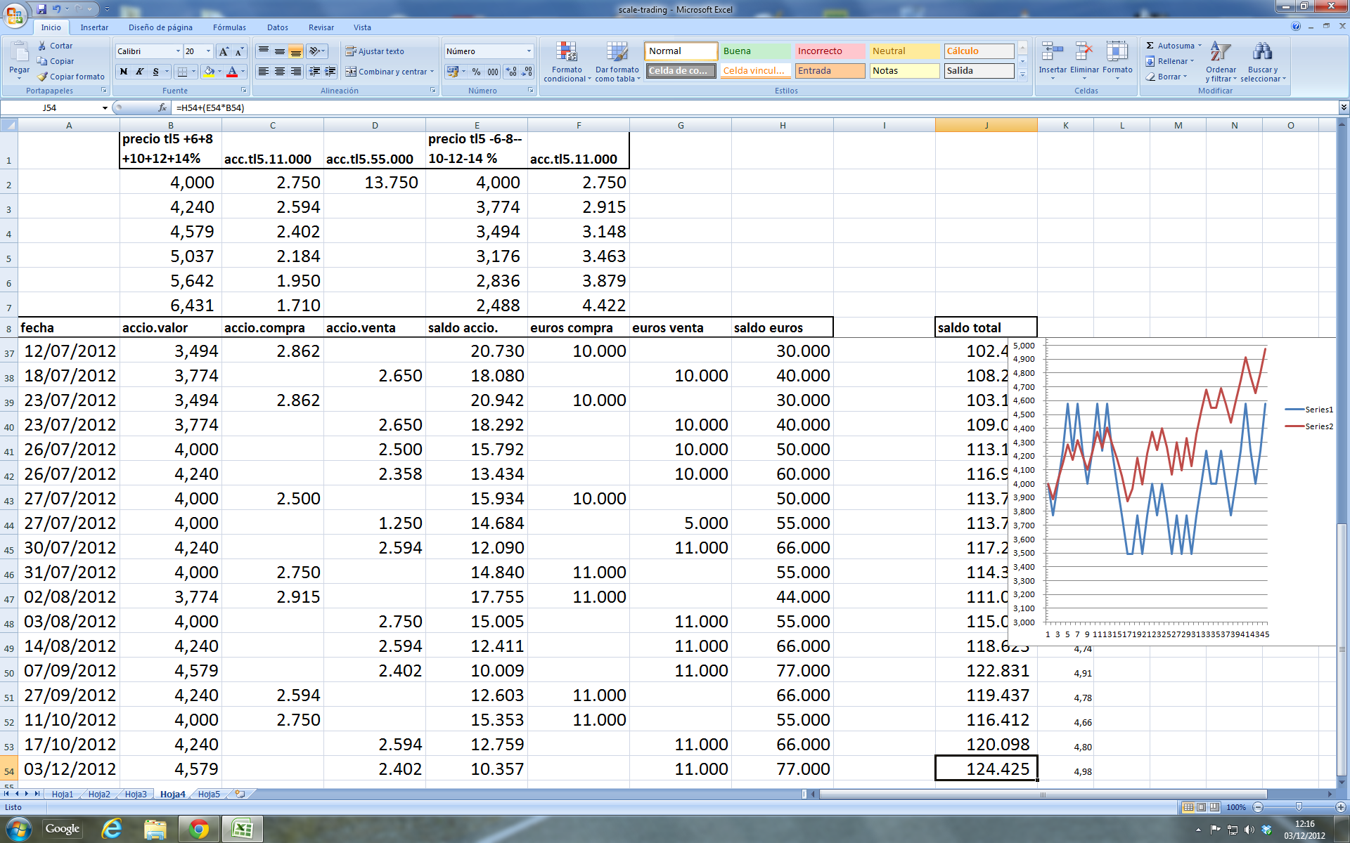 Seguro que meto la pata, pero me pareció entender que empezó comprando y lo que hace cuando sube x vende parte de las compras, que no es lo mismo que ponerse corto.La pega que tiene es que se produzca un tendencia fuerte y duradera... te quedas con el culo al aire