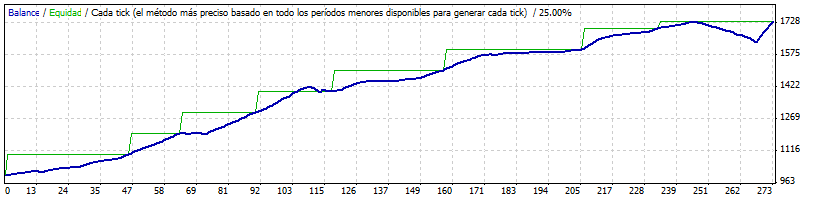 Ahora bien, aunque veas siempre la equity por encima del balance y éste sin valles, no quiere decir que el sistema no tenga DD's. Los tiene, aunque limitados. Y también es cierto que premeditadamente escogí un período de ganancia contínua para que se vean claramente los peldaños de la escalera. Esto si es una escalera de verdad y no la pseudo escalera de guevon, jajaja.