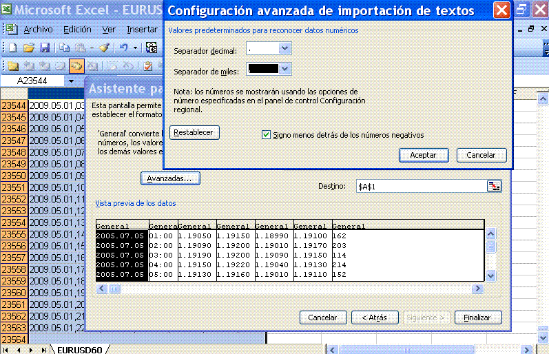 Hola, estoy tratando de aplicar la exportacion de datos de visual chart a Excel tal y como lo explican Bolsa1 y Xtrader en varios articulos, pero TENGO UN PROBLEMA, es que al exportar los datos del mini sp 500, los coloca con un punto que son los ticks, por ejemplo 1400.25, entonces al no llevar COMA no me funcionan las formulas en Excel.