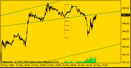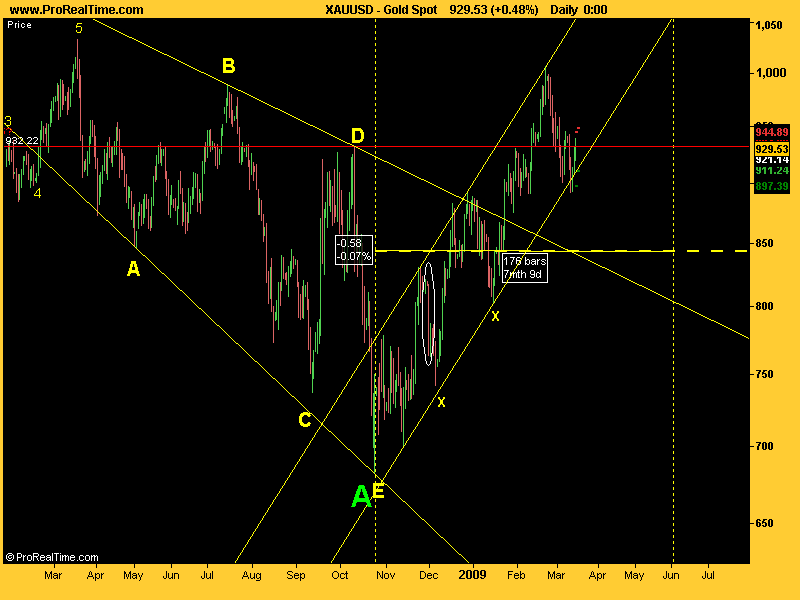 Pos el oro está atascao en los famosos 930. En la caidita no se observa más velocidad que en los anteriores retrocesos de la subida (véase el día que he marcao con una elipse). Eso, según Neely, significa que la onda que va hacia arriba no ha terminado. Cuando termine deberíamos ver un movimiento con determinación más rápido: evidentemente sería una onda del mismo grado pero en dirección contraria.Pero eso, según Neely, tampoco sería indicativo de que la subida vaya a hacer nuevos máximos: muchas veces las ondas NO acaban en el máximo. Asín que, mientras esté en el canal y no veamos un día bajista de er copón, pues habrá que pensar que sigue alcista.