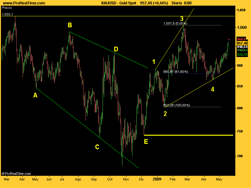 Y ahí va el oro. Visto que la onda 4 ha retrocedido un poquito más del 61% a la tercera y que es brutalmente mayor que la 2 en precio y tiempo, pos he de decir que tiene la pinta todita por ahora de que la 5 vaya a fallar y en cualquier momento de estos tope. Ahora bien, como no es un patrón corriente, lo mejor es esperar que haya un día muuuuy bajista como señal, porque si el recuento es correcto, debería caer como un higo maduro y una caida así, como que avisa :lol: Por otro lado, si la 5 falla, debe hacerlo en un lugar clave: supongo que entre 970-990. Si pasa por ahí como si ná supongo que haría una quinta extendida, pauta que tampoco domino un pijo :shock: habrá qu e buscar info...pero vaya, que el fallo me cuadra con to el panorama general mejor: me da a mí que to esto no es sino una trampa alcista y a la que nos descuidemos se gira todo.
