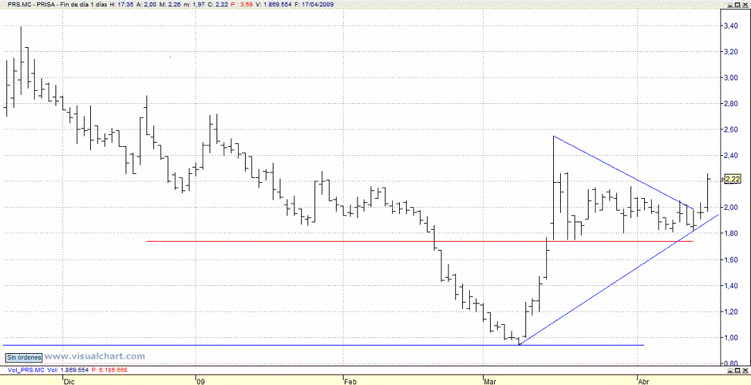 sin duda la estrella de la semana y del año, esta semana superó la resitencia inclinada a la baja que llevaba desde hacía unas dos semanas, lo hizo con un gran volumen y justo lo que parecía el peor día del ibex, eso me hixo entrar en el valor en 2.97 y me salí la mañana siguente en 3.2x, menos de una hora de operación.