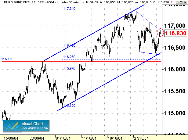De momento sigue alcista, lo más probable es que ahora toque corregir la subida desde los 116.92 hasta los 117.50, con posible suelo para la corrección en 117.30 €. En caso de pederse los 117.15 podría haber finalizado la onda 5 o, lo que yo empezaría a pensar, esta 5 sería una terminal.