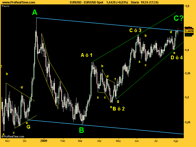 Este triángulo que he puesto tiene por norma que la onda B es demasiado corta y la D es la que compensa el desequilibrio. La B en este caso es casi igual que A en tiempo. La D sería la más larga en precio y, como se trata de un triángulo contracto, obviamente debe estar disminuyendo la velocidad a medida que avanza el triángulo...esto unido a que es una onda contratendencia...pues hace que dure tanto. No obstante, es exageradamente larga en tiempo...aunque también es fuerte en precio y delata cierta fuerza alcista...