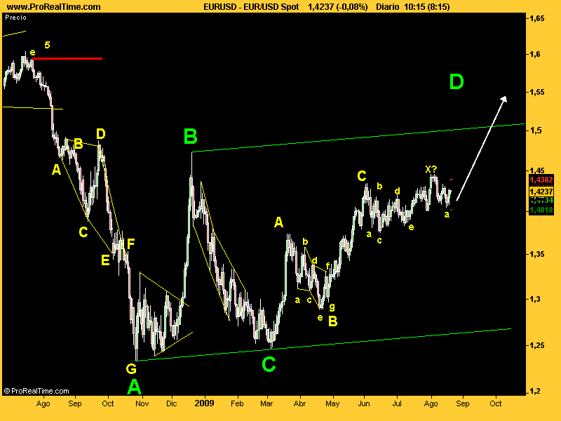 y puesto en plan pragmático viene a decir que la onda D ha de ser más larga que la b en precio, lo que nos llevaría a más allá del 1.4850 como mínimo...creo yo que no hay que pensar en el giro mientras no toque la línea paralela...