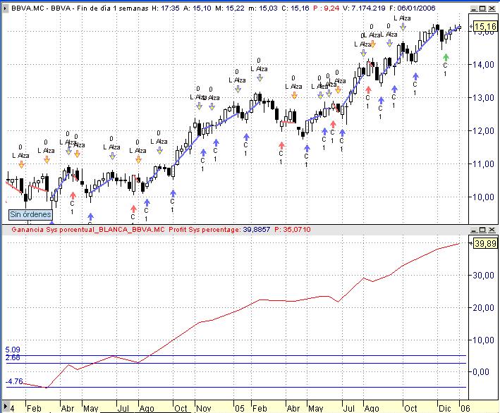 En el caso de haberlo aplicado al BBVA durante el año 2005 el DRAW DOWN hubiera sido del 5% (4.76 en el gráfico) y precisamente se hubiera dado al principio que es cuando más duele. Ese DD podría habernos hecho desistir de aplicar un sistema que nos hubiera dado del orden de un 40% de beneficio en un año.