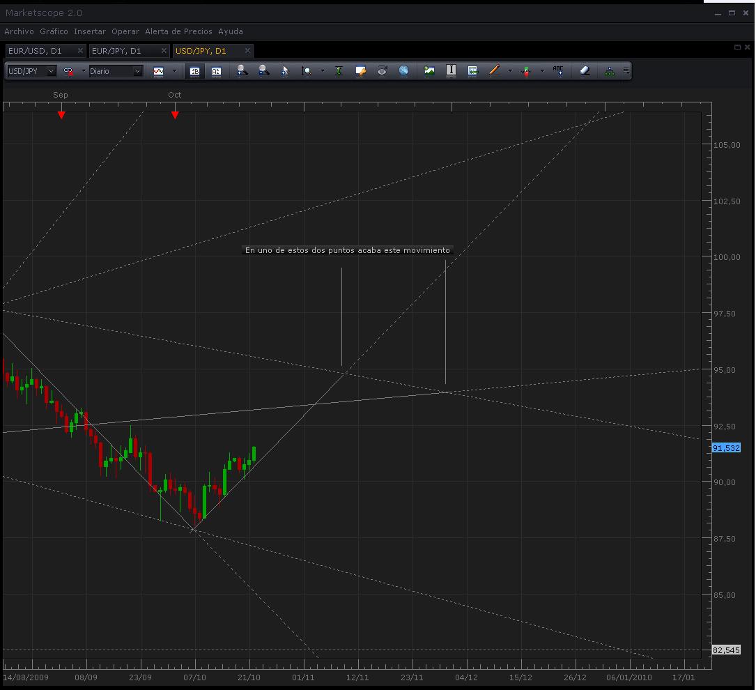 Pues despues de mirarlo bien, y aunque mi predicion de hace quince dias se va cumpliendo como un reloj, hoy no se, creo que no va a llegar a los puntos que puse, por lo menos en la fecha que estan marcados, me da que se va a adelantar la llegada a los limites de 95, no lo se, es una intuicion nada mas, pero me da que en cualquier momento el yen tiene que tomar alguna determinacion.
