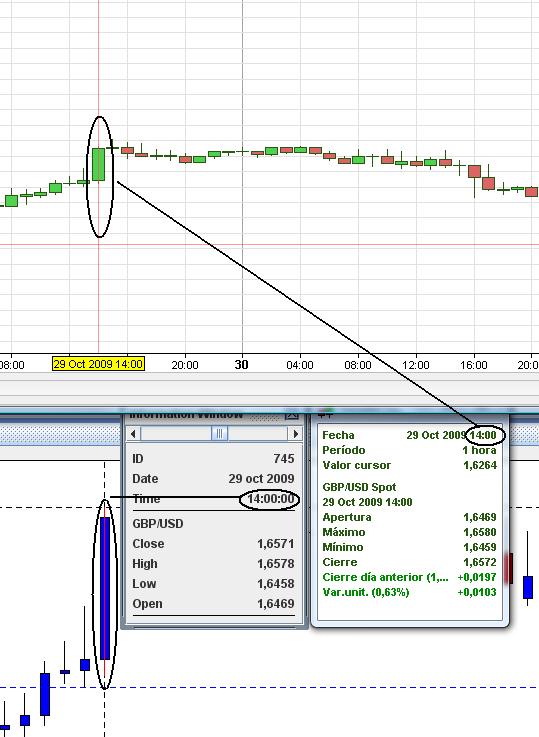 notese que en grafico inferior nos adelantamos al futuro, y tenemos dos velas verdes antes de las 23:00 y 24:00 del dia 18. cuando en realidad, la primera de ellas, fue a las 01:00 (grafico superior