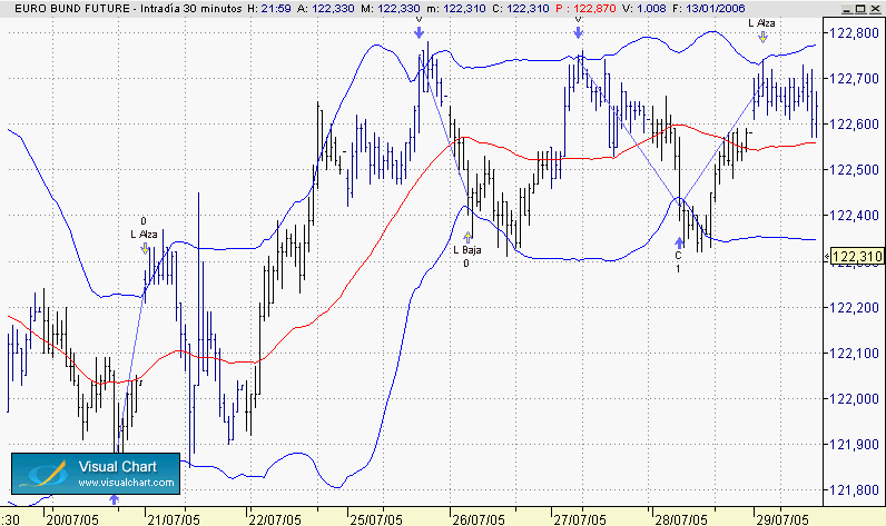 Demos un poco de tiempo para que alguien mas se apunte a la iniciativa y mientras tanto vamos trabajando. Tratare de explicar lo que se pretende que el sistema tiene que hacer, da igual el activo del cual se trate, las pautas repetitivas en bollinger son las mismas, es cuestion de optimizar los parametros de rangos de volatilidad , en principio deberiamos concentrar el trabajo en un solo activo con sus caracteriticas y volatilidad, por ejemplo el BUND. Las bollinger tiene unos movimientos repetitivos constantemente y siempre siempre son los mismos, estrechamiento de bandas ( cuellos de botella). rotura de bandas ( rotura del rango con aumento de la volatilidad) , inclinacion de bandas con aumento de volatilidad sin rotura de bandas,cierre de bandas ( final del movimiento previo). Estos movimientos se repiten constantemente , ahora veremos cada uno mas detenidamente y la forma en la que debe contratar el sistema, comencemos por el primer movimiento, es el mas importante, el mas fiable y el que mas tela da por ahora, en los rangos laterales se forra. ESTRECHAMIENTO DE BANDAS: este movimiento para que el sistema contrate ,( ATENCION A ESTO): las bandas deben estar paralelas y horizontales o con apenas inclinacion , marcando muy baja volatilidad de bollinger, estos movimientos son consolidaciones y laterales. El sistema contrata en las bandas exteriores al tocarlas al cierre de barra,el precio debe estar entubado perfectamente en rango horizontal, ahi la fiabilidad es del 80%¿como podeis conseguir esto? , darle al coco que hay solucion jejeje, una vez que se consiga entubar el precio habra que hacer pruebas para ver los mejores resultados sobre operaciones de cierre de posiciones o de giro mientras las bandas esten en esas condiciones, esto es muy importante . Pongo un ejemplo ilustrativo donde se ve perfectamente lo que se pretende que haga el sistema.Saludos coleguis jejeje :wink: :smt026