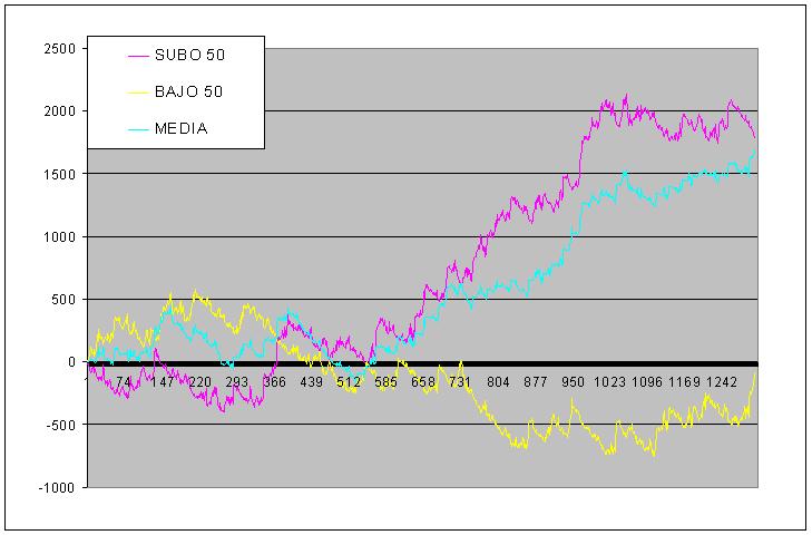 Tambien comprobamos como jugando con las dos direcciones de juego a la vez, la media resultante es positiva, bueno... tambien es logico, aunque yo ahi tengo mis dudas si esta bien hecha la estadistica, puesto que para mi intuicion (que se confunde casi siempre), la media resultante del juego en los dos sentidos deberia estar casi siempre por encima de las otras dos curvas, pero bueno, admitiriremos pulpo como animal de compañia y pensaremos que la estadistica esta bien hecha.