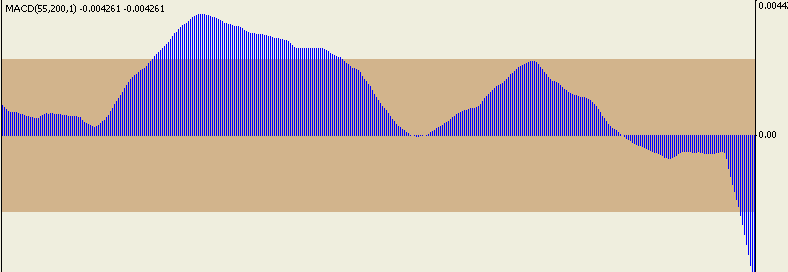 Existe algún indicador que dibuje zonas en el macd? Deseo que pinte una zona delimitada por dos niveles, por ejemplo entre 0.0050 y -0.0050, tal como se ve en la imagen.